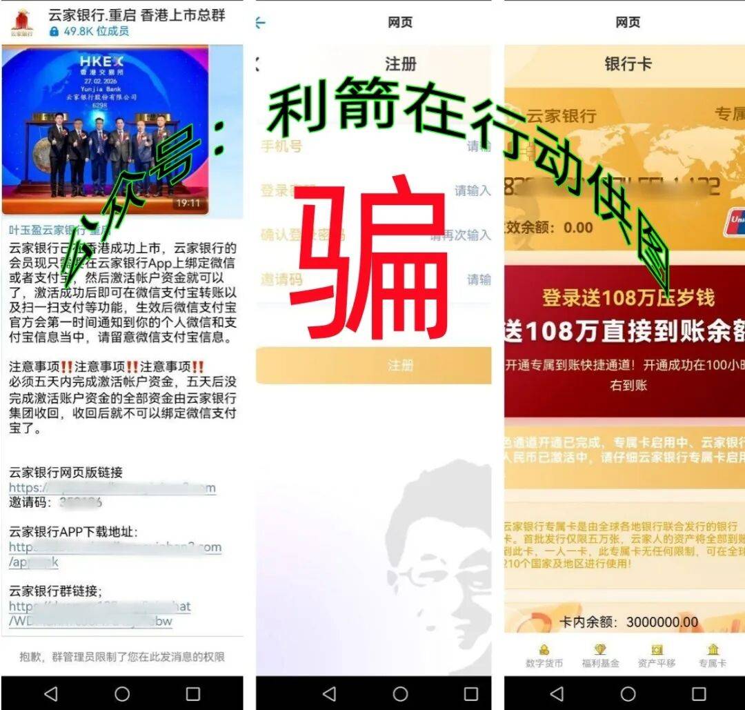 “云家银行”APP(二)中宣传给参与者108万元,以此为噱头骗取参与者身份信息与钱财。