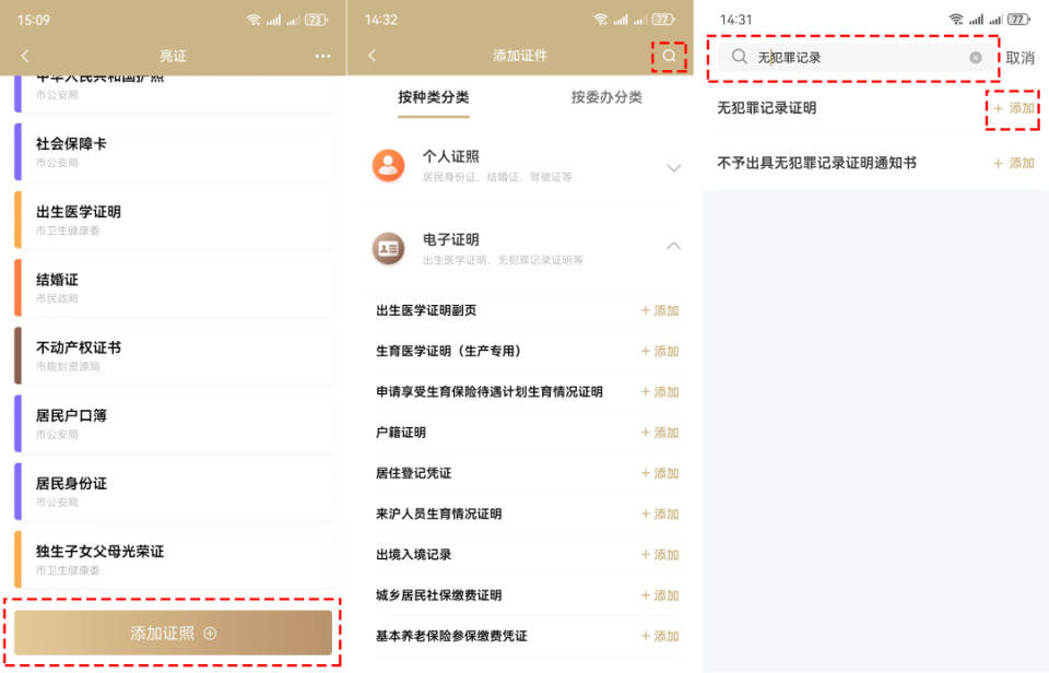 在“亮证”页面→点击“添加证照”→在“电子证明”中寻找或通过搜索关键字找到“无犯罪记录证明”,并点击“添加”。
