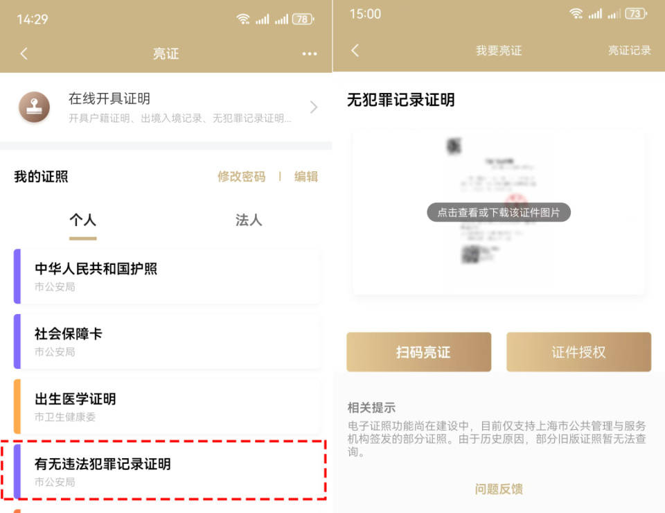 返回“亮证”页面→点击“有无违法犯罪记录证明”,即可查看/下载/授权该证明材料。