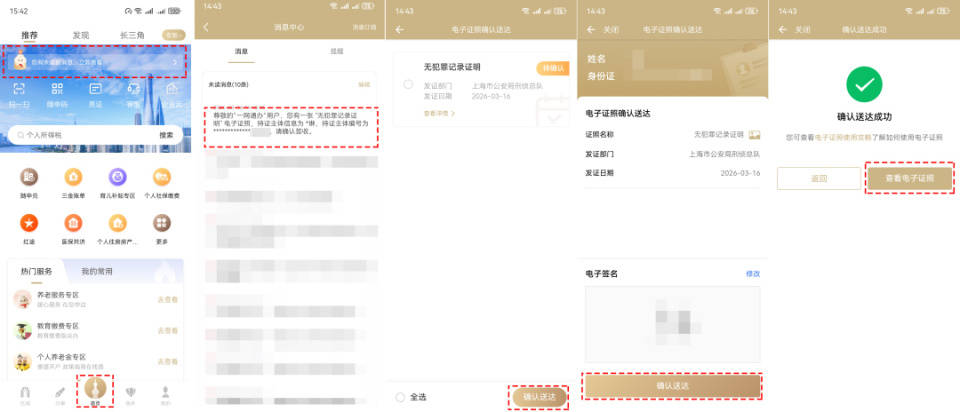 手机登录“随申办市民云”APP→点击“首页”的消息栏→点击申请通过的消息→点击“确认送达”→确认电子签名后,点击“确认送达”→点击“查看电子证照”。