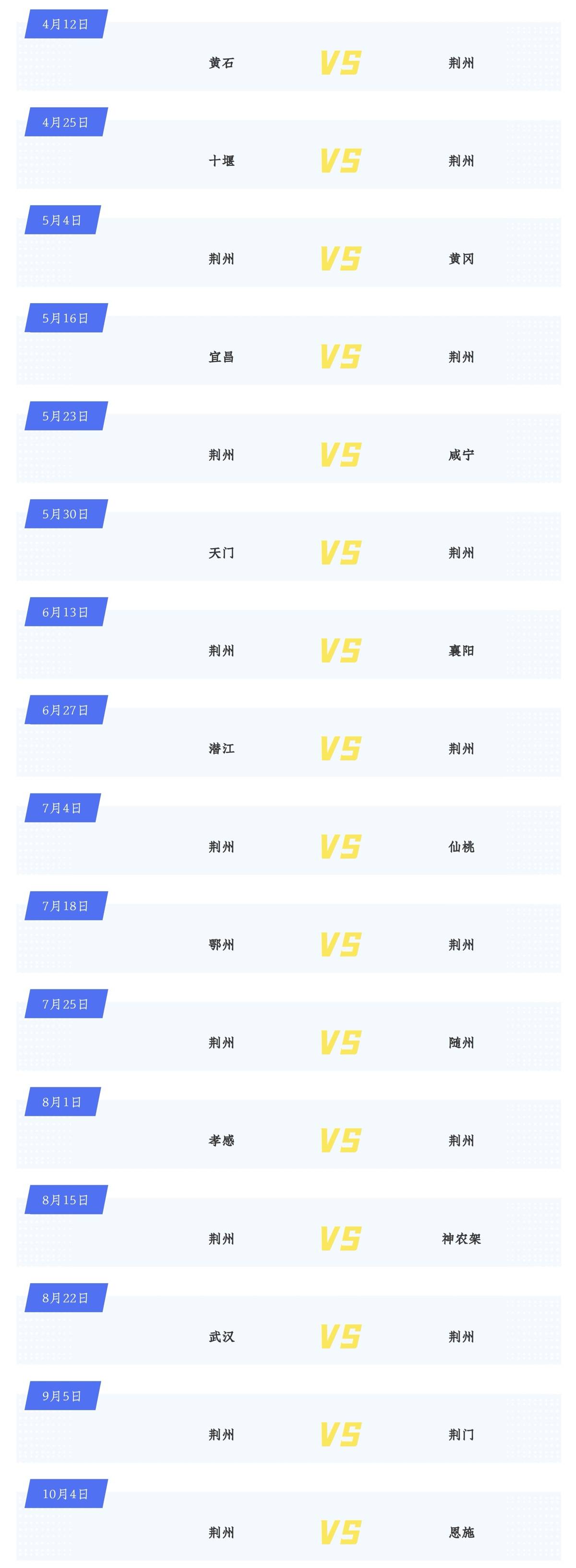 赛程信息:荆州队“楚超”首战于4月12日进行,客场与黄石队打响“楚超”揭幕战。