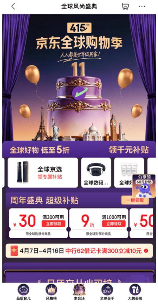不只汇聚全球大牌好物,此次京东全球购11周年庆还携手众多品牌为消费者提供“千元专属补贴”,海量大牌好物直降至5折,更有全球尖货1元拍等优惠活动。同时,即日起至4月16日,京东全球购还联合中国银行推出支付立减福利,消费者使用中行62开头借记卡购买京东全球购商品,即可享受满300立减10元优惠,叠加其他福利实现实惠升级。此外,京东全球购还将推出“人人都是推荐官——晒出我的心水好物榜”活动,用户只需分享自己在京东全球购心仪好物,即可领取60元专属补贴,让购物更具参与感与获得感。