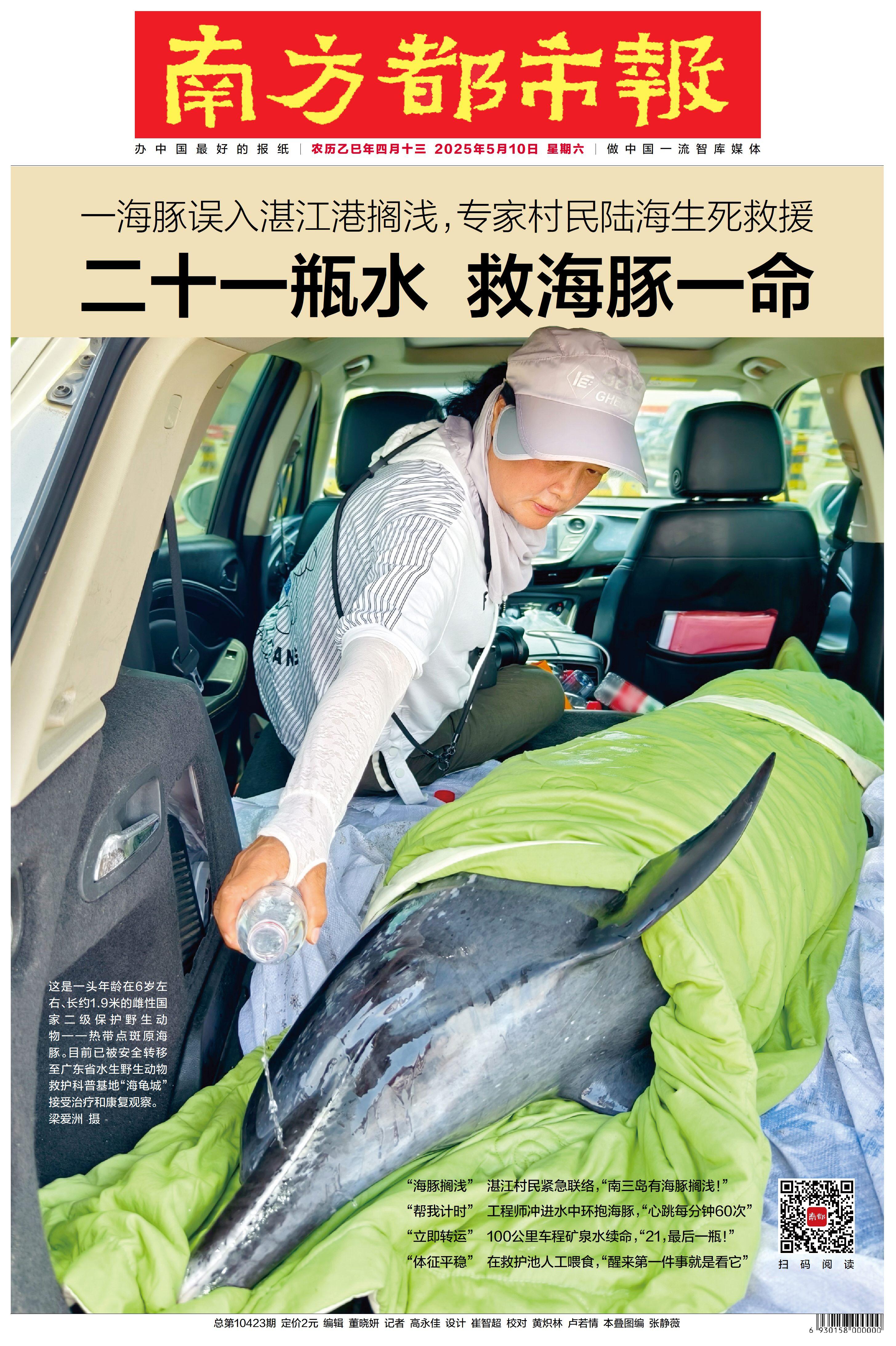 来自湛江的拍客何玲,就是一个最好的例证。2025年5月,一头江豚在南三岛搁浅。作为湛江市中华白海豚保护协会会员,何玲火速跟随专家和志愿者奔赴现场。100公里车程中,她一路参与救援、拍摄、与我保持着实时沟通,最终这则报道登上了当晚的《南方都市报》封面。