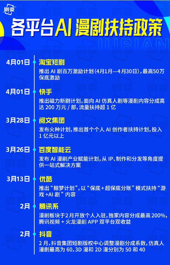 今年以来,AI短剧政策红利持续释放,腾讯、快手、阅文等各大平台纷纷跳出单纯的资金流量比拼,将焦点转向AI创作者,密集出台高额分成、现金投资等扶持政策,一场围绕优质人才的“军备竞赛”正式打响。