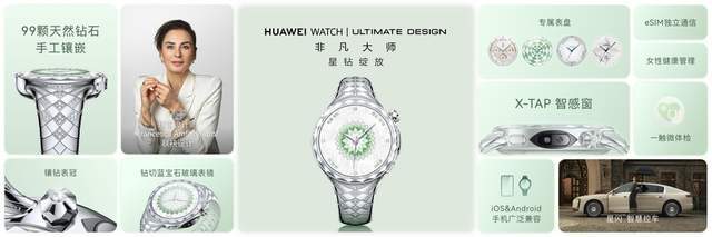 其中表带以斐波那契黄金比例曲线颗天然钻石;表冠中央镶嵌一颗天然钻石,呈现出玉兰花绽放的优雅姿态;表镜则用蓝宝石玻璃雕琢而成,采用微米级的一体化钻切工艺,尽显璀璨锋芒与极致匠心。表侧搭载X-TAP智感窗,支持一触微体检;此外健康管理方面,支持用户通过手表参与不同的专业健康研究项目,可进行血糖风险16、高血压风险17等评估;在女性健康管理方面,HUAWEI WATCH非凡大师 星钻绽放在女性健康研究中,首发支持多囊卵巢风险评估18,通过连续14天以上睡眠数据追踪,辅助用户尽早发现风险。同时支持腕上星闪™车钥匙、eSIM独立通信,助力每一次优雅出行。