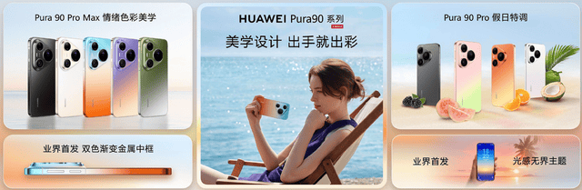 外观方面,HUAWEI Pura 90系列全系采用利落直屏,以情绪色彩构建新一代设计美学。HUAWEI Pura 90 Pro Max汲取假日旅行灵感,推出橘子海、霞光紫、翡翠湖、晨曦金、曜石黑五款配色,以多元缤纷色彩定义旅途的浪漫;HUAWEI Pura 90 Pro以假日特调为创意,带来粉红芭乐、橘子汽水、椰青白、桑果黑四款配色,缤纷鲜活诠释专属质感。搭配业界首发全新光感无界主题1,为用户带来全方位、沉浸式的视觉盛宴。HUAWEI Pura 90则以弦律几何为灵感,将超薄美学与假日质感相融。