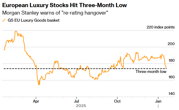 数据显示,上季度奢侈品板块估值升至近四年来的最高水平,高盛追踪该行业的股票组合的市盈率超过30倍。该板块自去年4月份跌至低点以来,截至2025年底已上涨21%。