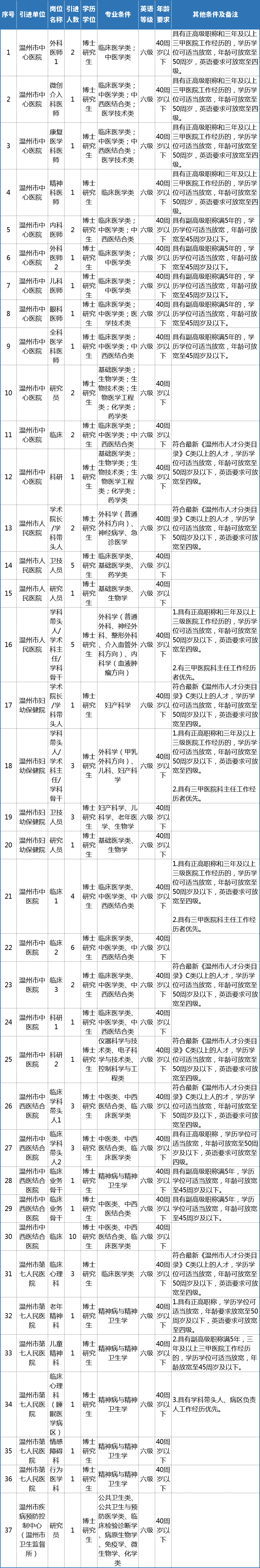 备注:1.人才其他条件需符合温州市选聘高层次紧缺人才工作实施意见的要求。2.对外语等级的要求,英语六级是指大学英语六级425分及以上(或雅思6.5分、托福90分、PTE60分及以上等);英语四级是指英语四级425(含425分)以上(或雅思4.5分、托福70分、PTE50分及以上等)。