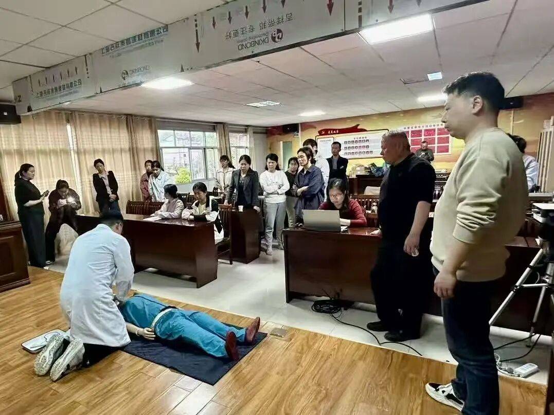 随后,盐田河镇分院主治医师胡大本组织全体医务人员开展现场实操演练,大家分组协作、反复练习,在高仿真模拟场景中熟练掌握心肺复苏及除颤仪操作流程,切实将理论知识转化为关键时刻“能施救、救得准”的实操本领。