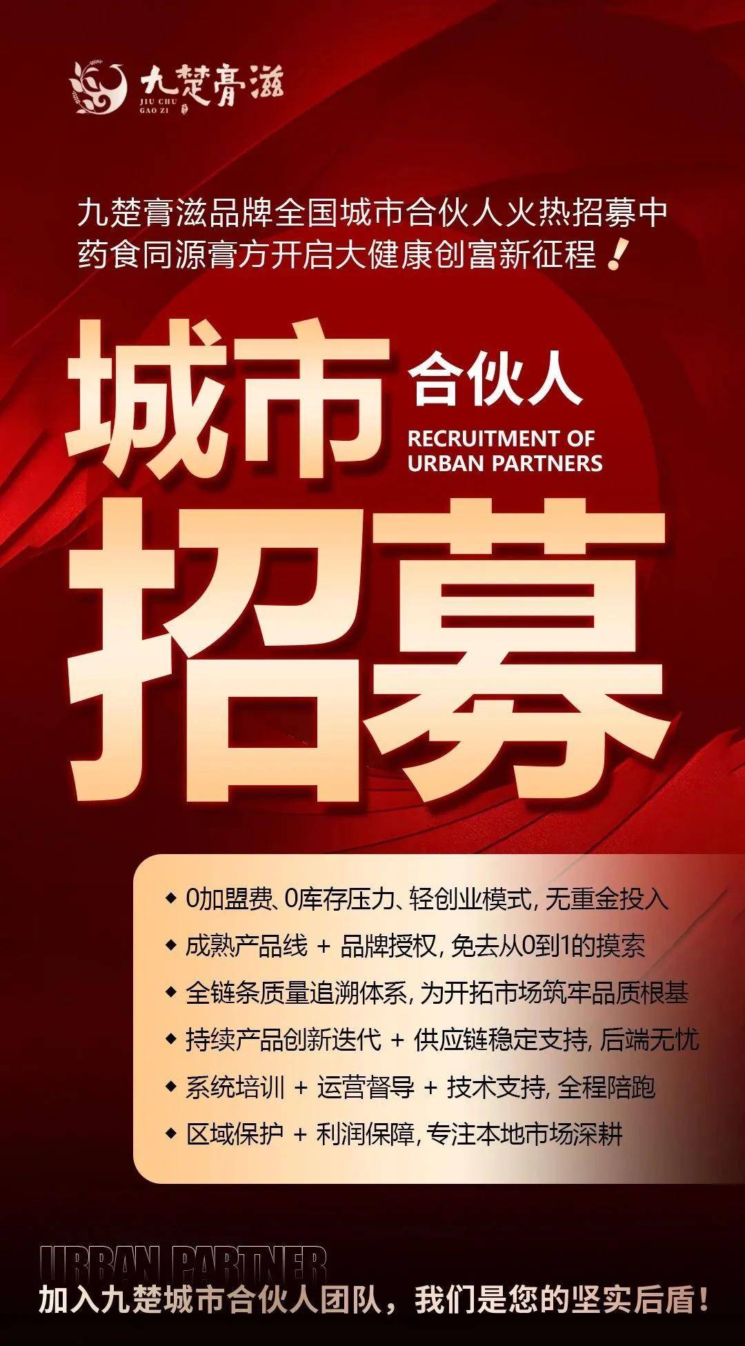 加入九楚城市合伙人,可享受0 加盟费、0 库存压力的轻创业模式,依托成熟产品线、品牌授权、全链条质量追溯体系,免去从零到一的摸索。同时,企业提供持续产品创新、稳定供应链、系统培训、运营督导、技术支持及区域保护,全程陪跑助力合伙人深耕本地市场、实现财富共赢。