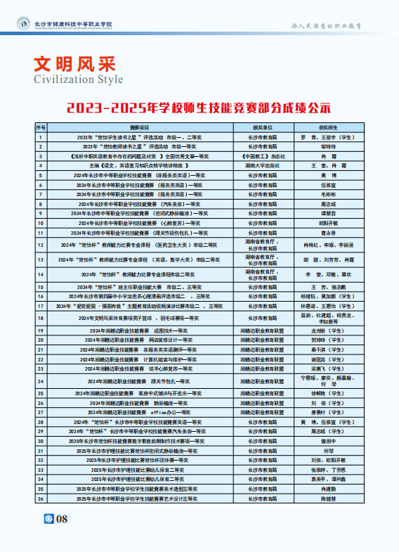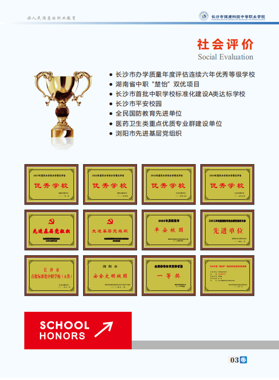 作为湖南省楚怡医药卫生优质专业群建设单位,学校 2020—2024 年连续五年获评长沙市办学质量水平评估优秀等级,以 “健康铸魂,科技育技” 为办学理念,践行 “坚韧不拔,奋发有为” 的校训,聚焦大健康产业人才培养,构建 “医药卫生为核心,交通、电子信息为两翼” 的专业发展格局,形成鲜明的办学特色。