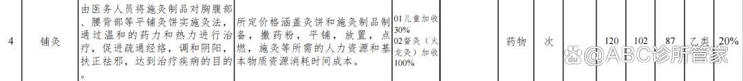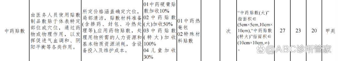●加收项:中药硬膏贴加收10%、中药贴敷(大)加收50%、中药贴敷(特大)加收100%、儿童加收30%
