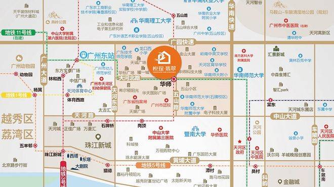 交通方面,悦珵·翡翠享受三地铁交汇的便利,广州地铁3号线号线在这里汇聚,最近的华师站仅步行约300米。乘坐地铁两站就能抵达广州东站,四站直达珠江新城,五站到广州塔,日常通勤或者周末出行都非常高效。从项目到广州东站开车仅约3公里,15分钟左右就能上高铁,一小时内轻松连接大湾区其他核心城市。周边300米内有龙口西路站、翰景路站、师大后门站、五山路站四个公交站点,覆盖超过20条公交线路,路网发达。广园快速和华南快速也在附近,驾车出行同样顺畅。