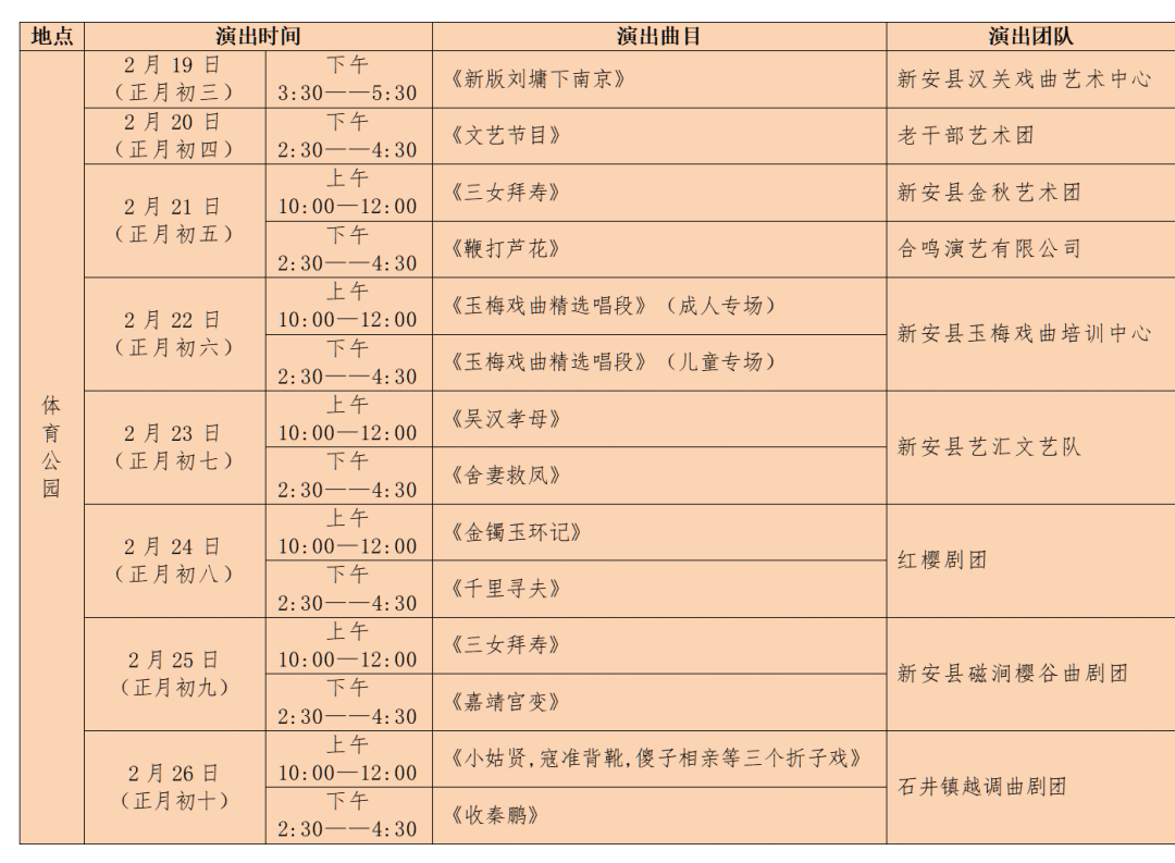 体育公园游泳馆南广场活动内容:汇聚专业戏曲团队、本土曲剧团及戏曲票友力量,以戏为媒、以曲传情,让戏迷朋友们在婉转戏韵中感受传统文化的独特魅力,在热闹氛围中凝聚新春团圆的温情,以文化之力绘就新安新春美好图景,让戏韵年味浸润佳节,点亮群众幸福年。