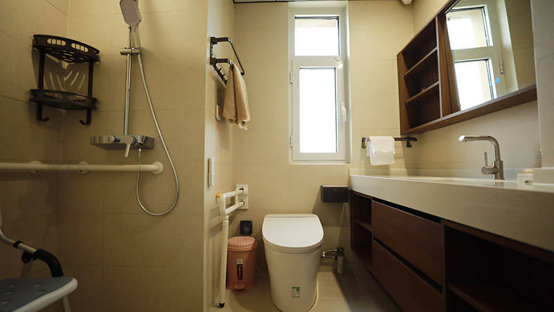 所有户型均配备全方位的适老化设计,从细节处守护长者的居住安全与便捷:卫生间配备安全扶手、无高差淋浴区,有效预防长者跌倒,同时配备防滑地胶,进一步提升安全性;家具采用圆角设计,避免长者碰撞受伤,配备应急电源和感应起夜灯,夜间起床无需摸索,既安全又便捷;衣柜配备下拉式衣杆,橱柜采用地柜内退设计,方便长者取用物品,无需弯腰费力;部分户型还专门预留了轮椅收纳区,并配置专业护理床,全方位适配半失能、失能长者的居住需求,让每位长者都能住得安心、舒心、放心。